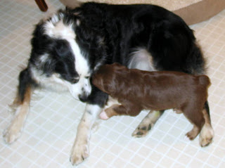 As part of their exposure to the real world the pups have all been introduced to the four legged members of the Hodges' household. Scout is the Aussie old man of the family, Rory is the grandmother of the litter (Viper's mother), Hallie is Viper's sister/littermate, Beenie and Piglet are the family cats. Here are a couple of pictures Hallie with the Red and Blue Merle Males.